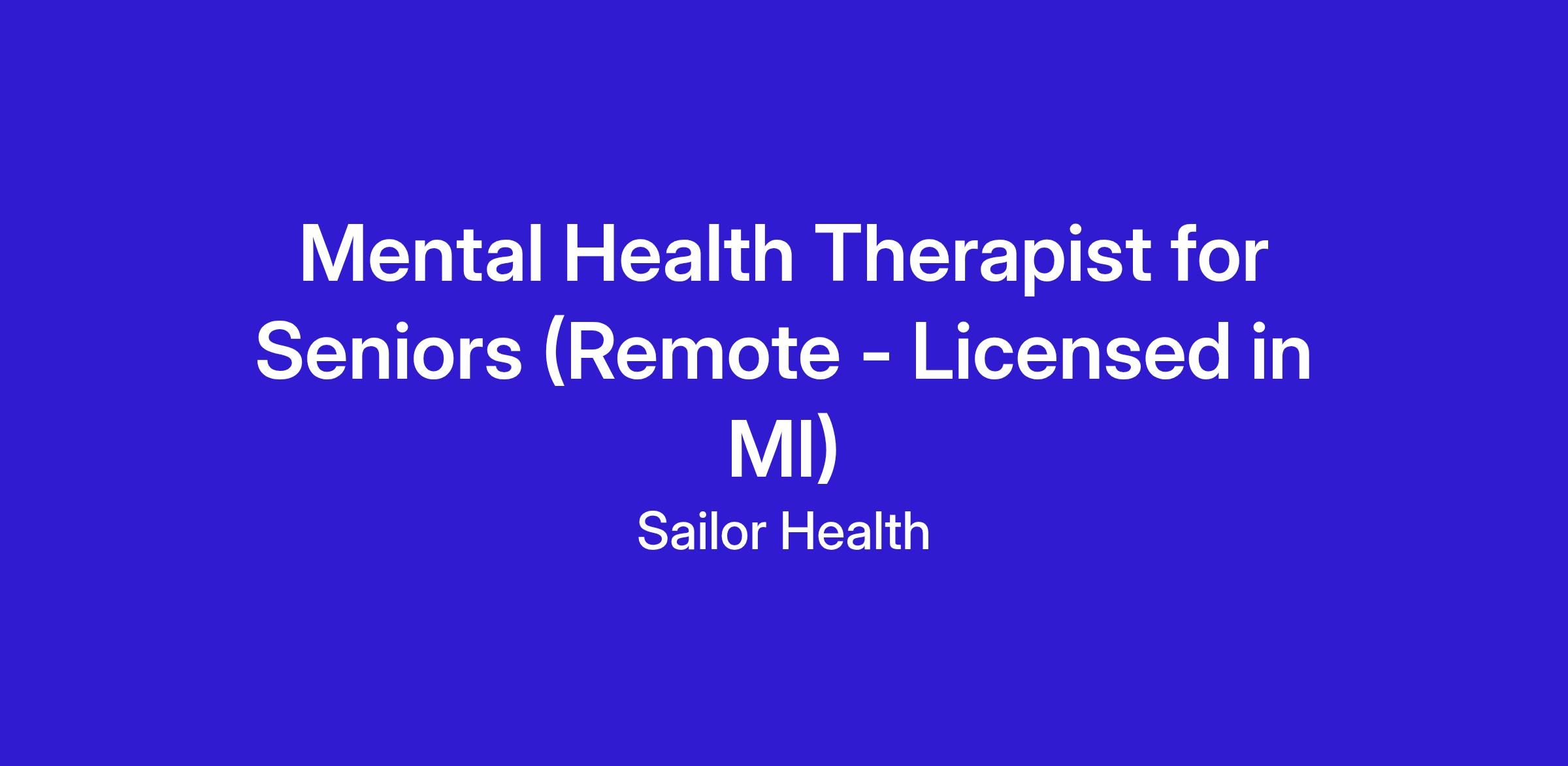 Sailor Health is a clinician-led virtual psychotherapy startup dedicated to improving the mental health and well-being of the senior population. We are seeking licensed mental health professionals to join our team and provide high-quality, compassionate zcare. As a remote company, Sailor offers unparalleled flexibility and work-life balance for therapists looking to work from the comfort of their home, while making a meaningful impact on the lives of seniors.