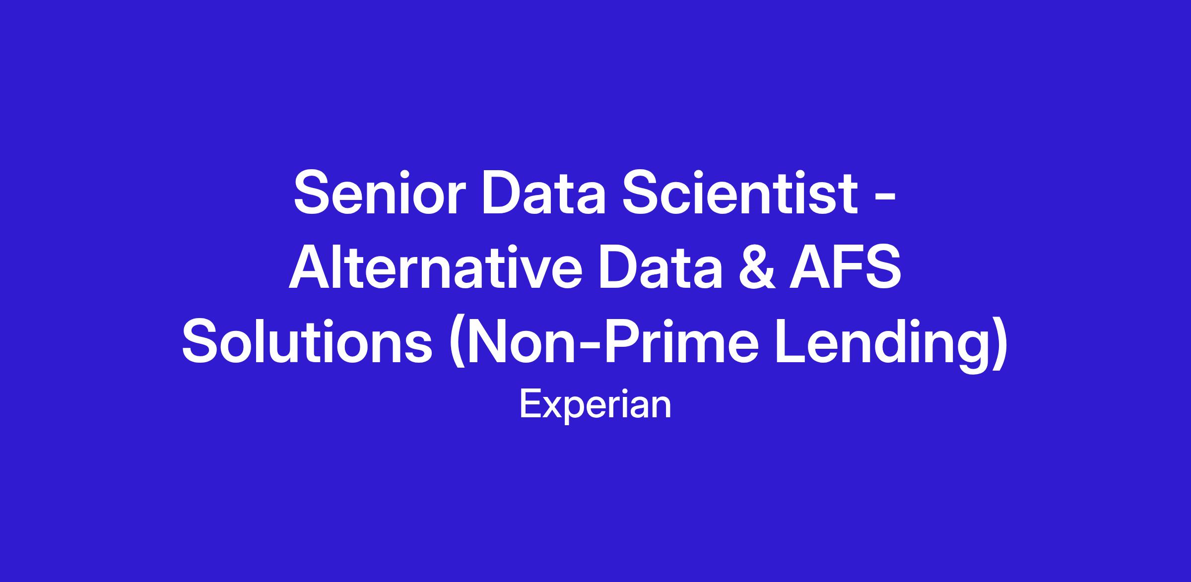 We are looking for an experienced Senior Data Scientist to join our Alternative Financial Services (AFS) department, supporting clients in the non‑prime and near‑prime lending markets. You'll design custom analytics, credit strategies, and machine‑learning models using both traditional and alternative data. This is a client‑facing, solution‑oriented role requiring technical depth and the ability to convert complex analyses into practical, applicable recommendations. You will report to the VP of Analytics Product Build, Innovation, and Scores.